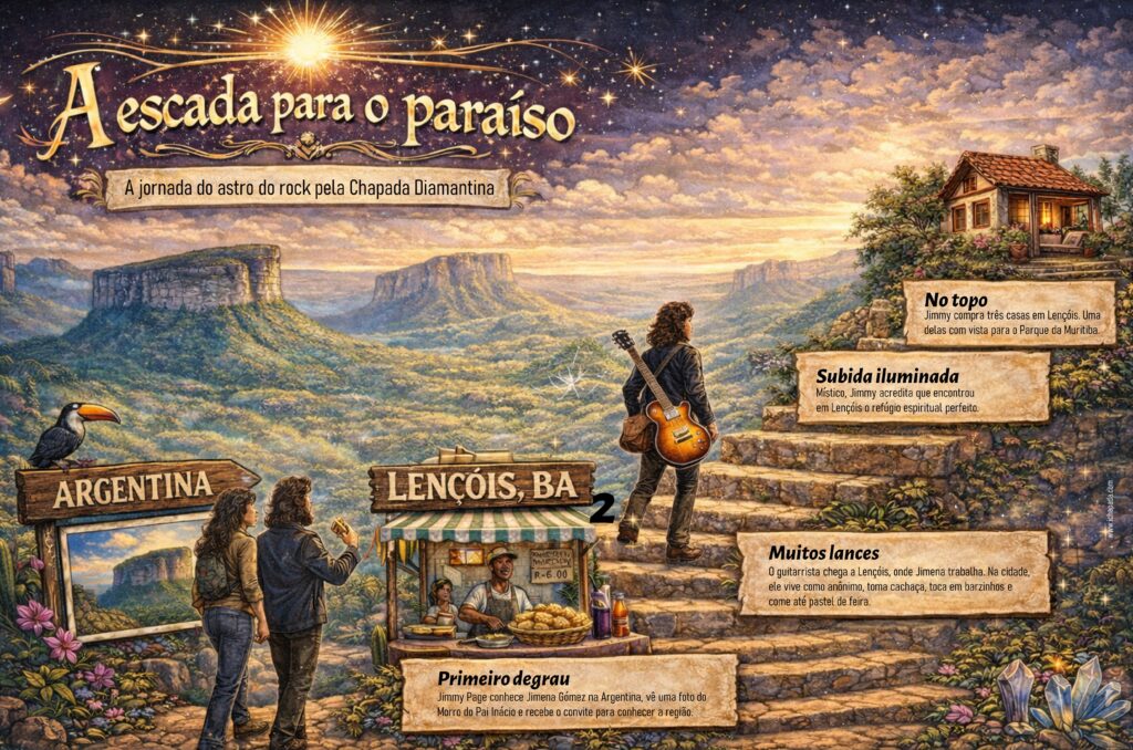 Foi Jimena quem fez o convite decisivo: conhecer Lençóis, na Bahia, cidade onde ela trabalhava. Ali acontecia o encontro mágico entre Jimmy Page e a Chapada Diamantina.