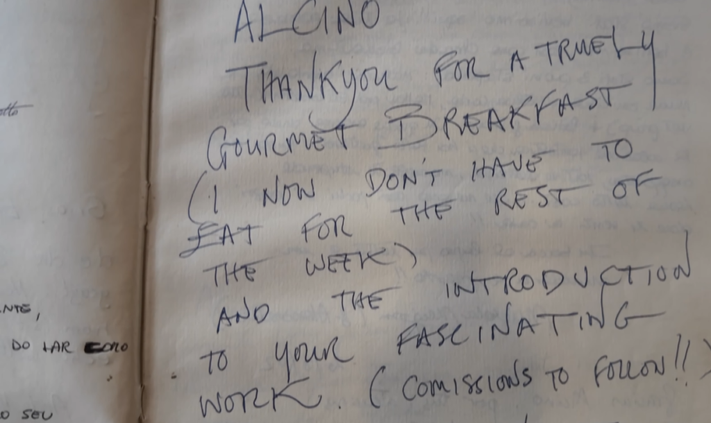 Elogio registrado por Jimmy Page no livro de visitas da Estalagem do Alcino. O texto declara que ali é servido um verdadeiro café gourmet e sugere que pimentas sejam adicionadas aos ovos mexidos. Foto: Lucas da Chapada.